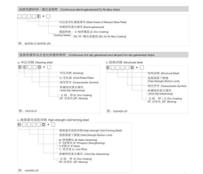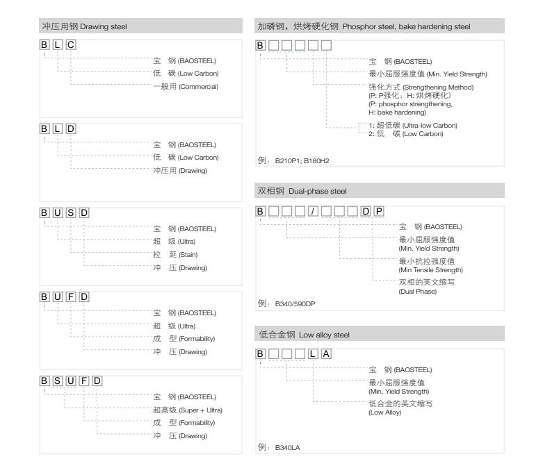 寶鋼產(chǎn)品的牌號一部分直接使用國外標(biāo)準(zhǔn)的牌號,一部分采用自己的命名方式命名。現(xiàn)簡要介紹寶鋼自己命名的牌號的方法。