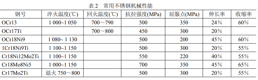 韌性較大及具有良好焊接性能的品種:OCr1 3、OCr1 7Ti、Cr1 8、OCr1 8Ni9、Cr1 8Ni8、1 Cr1 8Ni9Ti、Cr1 8Ni1 2Mo2Ti、Cr1 8Mn8Ni5、1 Cr1 7Ni1 3Mo2Ti、Cr1 7Mo2Ti。但用得比較多的還是 Cr1 8Ni1 8、Cr1 7Ti和 1 Cr1 7Mo2Ti。